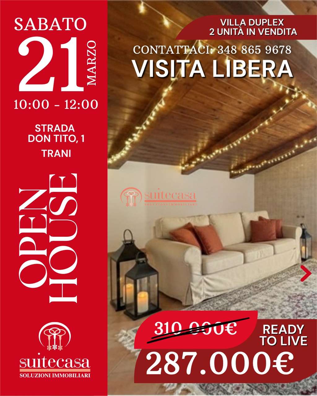 Per permettere a tutti di scoprirla dal vivo abbiamo organizzato un nuovo Open House. Sabato 21 marzo 10:00 12:00 Strada Don Tito 1, Trani Scorri il carosello per scoprire tutti i dettagli e partecipa allOpen House per visitarla dal vivo. 348 865 9678 Scrivici in DM o clicca il link in bio Villa Bifamiliare Immersa nel Verde Zona Donna Lavinia Il connubio perfetto tra indipendenza, ampi spazi e comfort moderno. Situata nellesclusiva e ricercata zona Donna Lavinia, proponiamo in vendita una magnifica villa unifamiliare del 2007, già perfettamente predisposta per accogliere due nuclei familiari in totale autonomia. La proprietà si distingue per la sua versatilità, l'efficienza degli impianti e unarea esterna monumentale. Caratteristiche Principali Doppio Livello Indipendente: 160 mq interni (80+80). Due unità abitative distinte e separate, ideali per genitori/figli o per chi desidera una zona lavoro/ospiti completamente isolata. Costruzione Recente (2007): Struttura solida e moderna in Classe Energetica D, un valore aggiunto per il risparmio energetico e la tenuta dell'investimento. Parco Privato: Un immenso terreno di 6.000 mq, unoasi di pace dove poter realizzare una piscina, un frutteto o semplicemente godersi il massimo della privacy. Finiture, Comfort e Dotazioni Tecniche La villa è pronta per essere abitata e vanta dotazioni di alto livello che garantiscono totale autonomia gestionale: Autonomia Idrica e Scarichi: Le unità sono dotate di vasca Imhoff a norma e di una capiente cisterna da 30.000 litri d'acqua, garantendo efficienza e indipendenza. Comfort Termico: Climatizzazione completa e suggestivo termocamino per calde serate invernali. Eleganza: Pavimentazione uniforme in gres porcellanato, resistente e raffinata. Sicurezza Totale: Porta blindata e sistema di antifurto perimetrale e volumetrico. Perché sceglierla? È la soluzione rara per chi cerca due case vere in una, con impianti tecnici solidi e un terreno dalle metrature introvabili in questa zona. Contattaci oggi stesso per una visita privata e scopri il potenziale di questa dimora straordinaria.