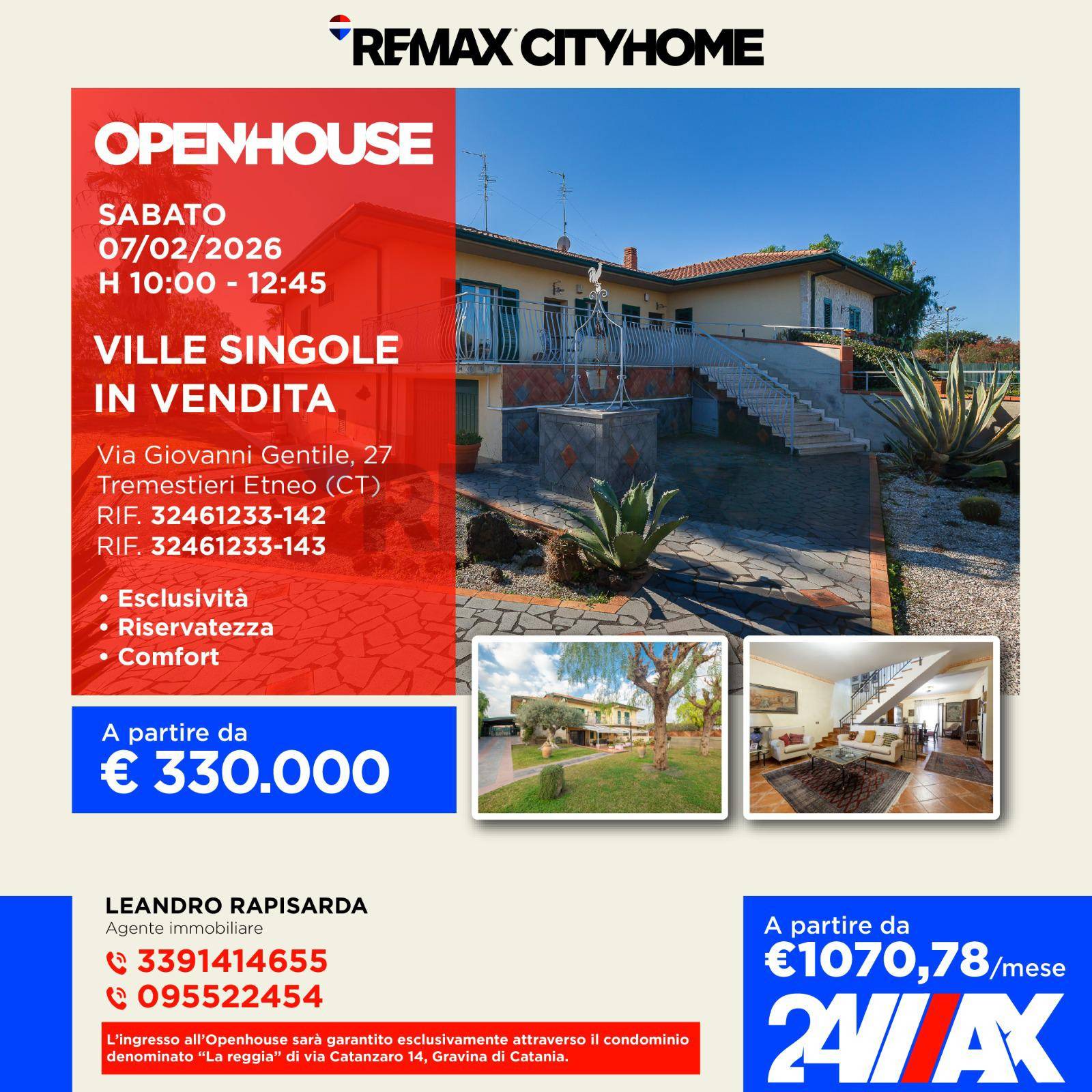 OPEN HOUSE SABATO 7 FEBBRAIO DALLE 10:00 ALLE 12:30 Tremestieri Etneo Panoramica Villa singola con ampio giardino. Siamo lieti di presentare una soluzione immobiliare completa, solida ed elegante, ideale per chi desidera una villa indipendente di rappresentanza, immersa nel verde ma perfettamente inserita in un contesto urbano servito e strategico. La villa sorge su un ampio lotto di terreno e si distingue fin da subito per la presenza di due ingressi carrabili, elemento che garantisce comfort, funzionalità. L’accesso alla proprietà avviene attraverso un giardino curato, arricchito da essenze ornamentali e dotato di impianto di irrigazione, che accompagna armoniosamente verso l’abitazione e ne valorizza il carattere indipendente. La distribuzione interna si sviluppa su tre livelli, collegati da scale interne in marmo, che conferiscono continuità agli spazi. Il piano terra accoglie l’ingresso principale su un ampio soggiorno doppio, luminoso e ben proporzionato, affiancato da due camere da letto e doppi servizi, offrendo una zona giorno e notte comoda e funzionale. Il piano primo mansardato ospita due ulteriori camere da letto, ideali come area notte aggiuntiva, studio o spazi dedicati agli ospiti. Il piano entro terra, regolarmente collegato all’abitazione, è destinato a cantina ed è composto da una spaziosa cucina-soggiorno, un ripostiglio e un bagno, risultando estremamente versatile e adatto a molteplici utilizzi. Completano la proprietà un garage di grandi dimensioni e un portico coperto per il ricovero delle auto, oltre a balconi e terrazze che garantiscono affacci gradevoli e luminosità durante l’intera giornata grazie all’esposizione mista. La conformazione del terreno consente inoltre la realizzazione di una piscina, valorizzando ulteriormente l’area esterna. A rendere la villa particolarmente suggestiva è la splendida vista panoramica sull’Etna, che impreziosisce l’abitazione e ne rafforza il carattere esclusivo.